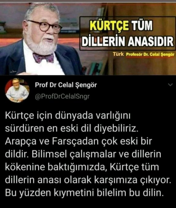 Profesor Doktor Celal Şengor yekî tirk e û bi perwerdeya kemalîst a li ser înkara kurdan ava bûye, dibêje, “Em ji bo kurdî dikarin bêjin ku zimanê herî kevn ê hebûna xwe dide dewamkirin. Ji erebî û farisî gelek kevintir e. Ku em xebatên zanistî û koka zimanan dinêrin, kurdî weke maka hemû zimanan derdikeve pêş me.” (Profesor Doktor Celal @ ProfDrCelalSngr.