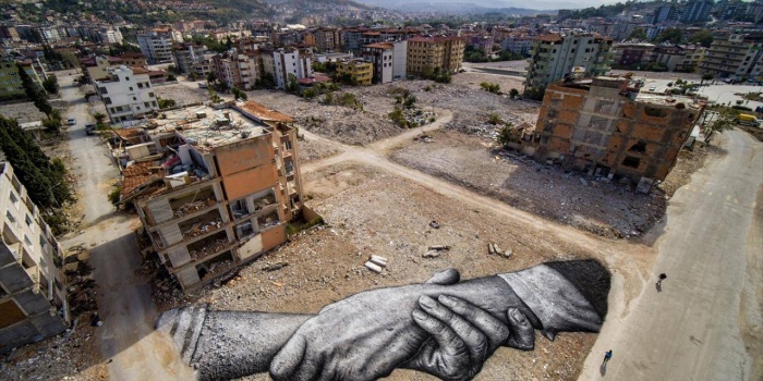 Hunermendê Fransî Saype, bi xebatên xwe yên grafîtî tê naskirin; wî ji bo balê bibe ser hevgirtin û yekîtiyê, li herêmên ku erdhej çêbûbûn yên li Tirkiyeyê du destên ku hevdu digirin xêz kirin.
