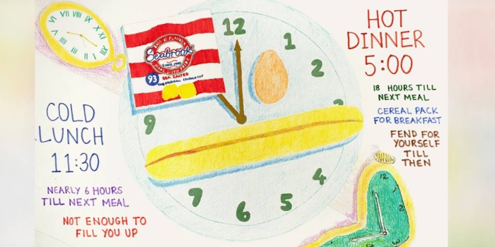 Girtiyê bi navê Ahmed M. diyar dike ku moralê girtiyan gelek caran bi xwarinê ve girêdayî ye. Wî di xêza xwe ya bi navê “Fried for Yourself” de bal biriye ser danên xwarinê û dide zanîn ku navbera danên xwarinê gelek zêde ye. Li hêla din girtiyê bi navê Osman jî dibêje, menuyên xwarinê jî derewîn in û pirrî caran mirov bi wan dixapin. Osman got; “Dema mirov li menuyên wan dinihêre, navê xwarinan xweş tê guhên mirov, lê rastî ne wisa ye.” Ahmed M. jî dibêje, “Li vir her tişt eynî ye…menu du hefteyan carekê tên guhertin. Mehê carekê jî ‘beefburger’ didin. Kede jî tine ye, tenê kuftik! Yanî mehê carekê xwarineke ku we li derve tah dikir, didin we; tenê ewqas. Tenê pariyek…”