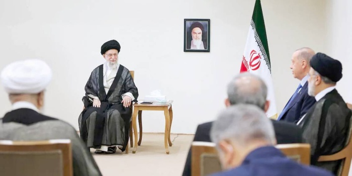 Beriya civîna sêalî, civîna pêşî di navbera rayedarên Îranî û serokkomarê dewleta Tirk a dagirker Tayyip Erdogan de hate kirin. Pêşî serokê ruhanî yê Îranê Alî Xamaney û Tayyipû erdogan rûniştin. Piştî civînê ofîsa Xamaney daxuyaniyek da û got, “Her êrişa leşkerî ya li dijî bakurê Sûriyê wê zirarê bike li Sûrî, Tirkiye û Herêmê. Divê Îran, Tirkiye, Rûsya û Sûriye pirsgirêkê bi diyalogê çareser bikin.”