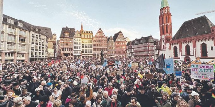 Li bajarê Frankfurt ê Elmanyayê, bi banga 130 saziyên civaka sivîl, li dijî nijadperestiyî mîtîngek hat lidarxistin û 25 hezar kes tevlî bûn. Di mîtînga ku bi dirûşmeya ‘Frankfurt demokrasiyê diparêze’ de, bal kişandin ser xeteriya polîtîkayên AfD’ê. Ji bo mîtîngê dihat payîn ku 7 hezar kes beşdar bibin, lê polêsan weke 19 hezar destnîşan kirin, lê organîzatoran ragihandin ku 25 hezar kes, tevlî çalakiyê bûne.