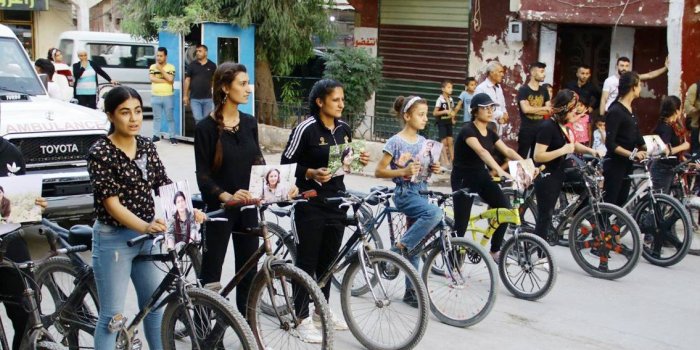 Bi diruşma “Em tolê hilînin û terorê têk bibin” Yekitiya Jinan a Ciwan bi hevkariya Nivîsgeha Yekîtiya Werzîşê li taxên Şêxmeqsûd û Eşrefiyê yên Helebê, pêşbaziya bisiklêtan a jinan a kîlometreyekê li dar xist.