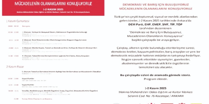 Partiya Wekhevî û Demokrasiyê ya Gelan (DEM Partî), Partiya Tevgera Kedkar (EHP), Partiya Azadiya Civakî (TOP), Partiya Kedê (EMEP), Partiya Karkerên Tirkiyeyê (TÎP) û Federasyona Meclisên Sosyalîst (SMF) dê bi dirûşma “Em ji bo demokrasî û aştiyê dicivin, li ser derfetên têkoşînê diaxivin” komxebatê li dar bixin. Komxebat dê 2 rojan bidome. Di komxebatê de dê li ser krîzên demokrasiyê, tecrûbeyên rêveberiyê û rêbazên têkoşînê were axaftin. Komxebat, dê di 1 û 2’yê Mijdarê de bê lidarxistin. Gelek axêver dê tev li komxebatê bibin. Komxebat dê li Navenda Perwerde û Çandê ya Odeya Endezyarên Makîneyê (MMO) bê lidarxistin.