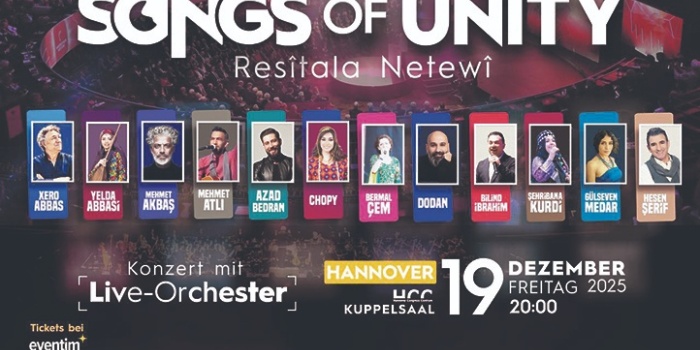 Şeva ku wê li bajarê Kuppelsaalê bi navê ’Songs of Unitiy/Resîtala Neteweyî’ were lidarxistin de, hunermend Xêro Ebas, Yelda Ebasî, Mehmet Akbaş, Mehmet Atli, Azad Bedran, Çopî, Bermal Çem, Dodan, Bilind Îbrahîm, Şehrîbana Kurdî, Gulseven Medar û Hesen Şerîf wê derkevin ser dikê. Şeva ku tê de wê stranên ji her zaravayên Kurdî wêrin gotin, wê bibe yek ji çalakiyên ji bo yekîtî û piştgiriya çandî. Projeya orkestraya ku wê ji çar parçeyên Kurdistanê 12 hunermendên Kurd bigîhîne hev, weke porejeyeke bêhempa ya mîrasa dewlemend a mûzîka Kurdî bi asoyên berfireh ên mûzîka cîhanê digîhîne hev, tê pêşkêş kirin. Serkêşê orkestrayê Erdem Altinsese ku gelek amûrên mûzîkê bi hosteyê lêdide û di gelek projeyên navneteweyî de cih girtiye, şefê orkestrayê û edîtorê mûzîkê ye. Kesê ku konseptê ji aliyê hunerî û organîzasyonê ve jiyanî dike Kerem Çelîk e, derhênerê hunerî yê projeyê jî Mehmet Akbaş e. Dikarin ji ser lînka li jêr bigîhên bilêtên konserê.