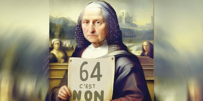 Xebatkar û endamên sendîkayên CGT-Culture û SUD Culture Solidaires li ber Muzeya Louvre strana bi navê “Mona Lîsa di grevê de ye” gotin û dirûşmeya “Macron qanûna xwe paşve vegerîne” gotin. Lê pankarteke ku Mona Lîsa li ser bû pirr bal kişand ser xwe. Li ser wêneyê Mona Lîsa “ji teqawîbûna 64 salî re na” hate nivîsandin û rûyê Mona Lîsa jî weke keseke pîr hat nîşandan.