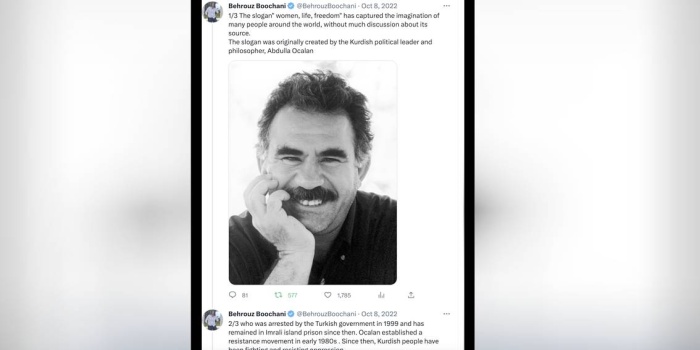 Doh di salvegera Komploya Navneteweyî de wî roja reş ji bîr nekir. Wî li ser hesabê xwe yê twitterê wêneyekî Rêber Abdullah Ocalan parve kir û wiha nivîsî: “Slogana jin jiyan azadî, îlham da gelek mirovan li seranserê dinyayê, lê li ser çavkaniya wê zêde minaqeşe nehat kirin. Serê pêşî, Rêberê siyasî û fîlozofê Kurd Abdullah Ocalan ew slogan çêkir. Hikûmeta Tirk sala 1999´an ew xist hepsê û ji hingê ve ew li hepsa giravê ya Imraliyê ragirtî ye. Hê di destpêka salên 1980´yî de Ocalan tevgereke berxwedanê ava kir. Ji hingê ve miletê Kurd li dijî zilmê li ber xwe dide û şer dike li ser esasê fîlozofiya wî; têkbirina DAIŞ´ê li Kurdistanê û li bakurê Sûrî jî beşek ji vê ne. Aktîvîsta siyasî Şîrîn Elem-Hûlî ev slogan li kaxezekê nivîsî û li ber cihê xwe bi dîwar ve kir di hepsa Evîn a li Tehranê de. Ew Gulana 2010´an hat bidarvekirin.”