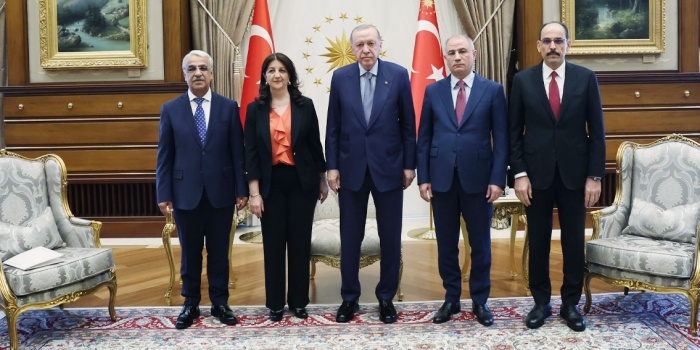 Endamên Şandeya Îmraliyê yên DEM Partiyê Pervîn Buldan û Mîthat Sancar, îro li Beştepeyê bi birêz Serokkomar Recep Tayyîp Erdogan re hevdîtin kir. Şandeya me, nêrîn û pêşniyarên xwe yên têkildarî qonaxa nû ya pêvajoyê û tiştên ji vir û şûnde dê bên kirin, parve kir. Di hevdîtinê de hate destnîşankirin ku îradeya her du aliyan a ji bo domandina pêvajoyê didome."