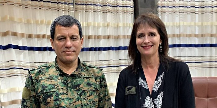 Wê wêneyê xwe yê hevdîtina xwe ya bi Fermandarê Giştî yê QSD´ê Mezlûm Ebdî re jî parve kir û got, “Malavahiya Mezlûm Ebdî û rêveberên din ên Bakur û Rojhilatê Sûrî dikin ku destek dan serdana min. Ez pirr razî me ku derfeta min çêbû bi çavên serê xwe bibînim çawa wan rêveberiyeke hêja ji zemînê civakê ava kiriye (Rêveberiyaq Xweser a Bakur û Rojhilatê Sûrî) ku azadiya dînî û wekheviya cinsan misoger dike. Êdî wext e ku civaka navneteweyî destekê bidiyê!”